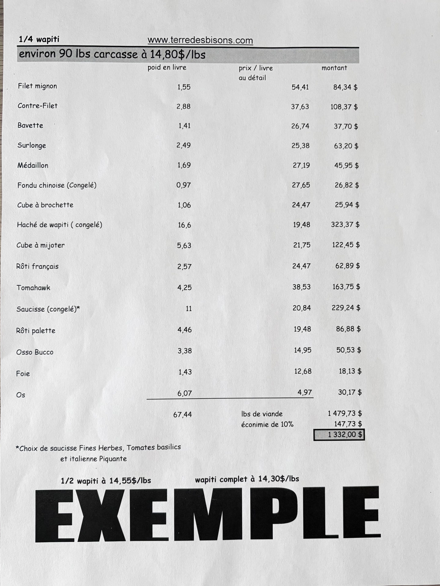 1/2 wapiti : 180lbs à 14.55$