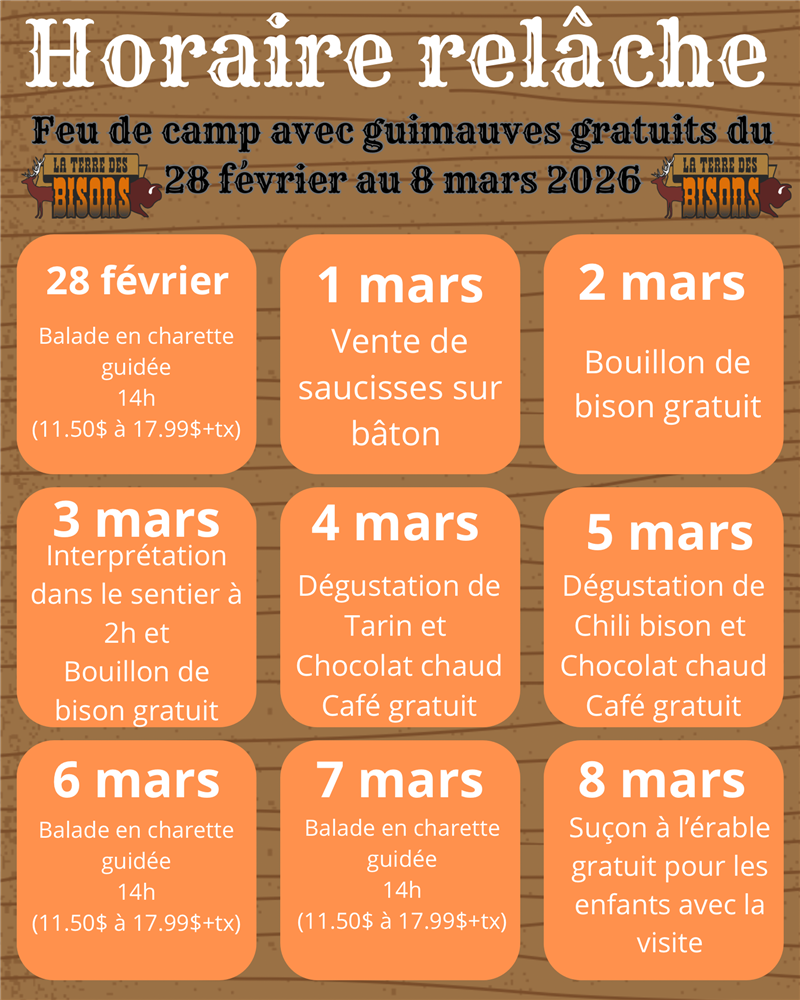 **Horaire pour la semaine de relâche 2026 du 25 février au 8 mars ouvert tous les jours**